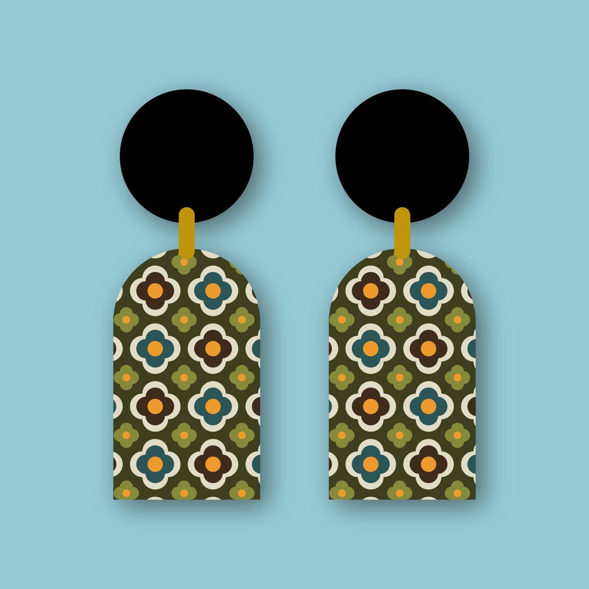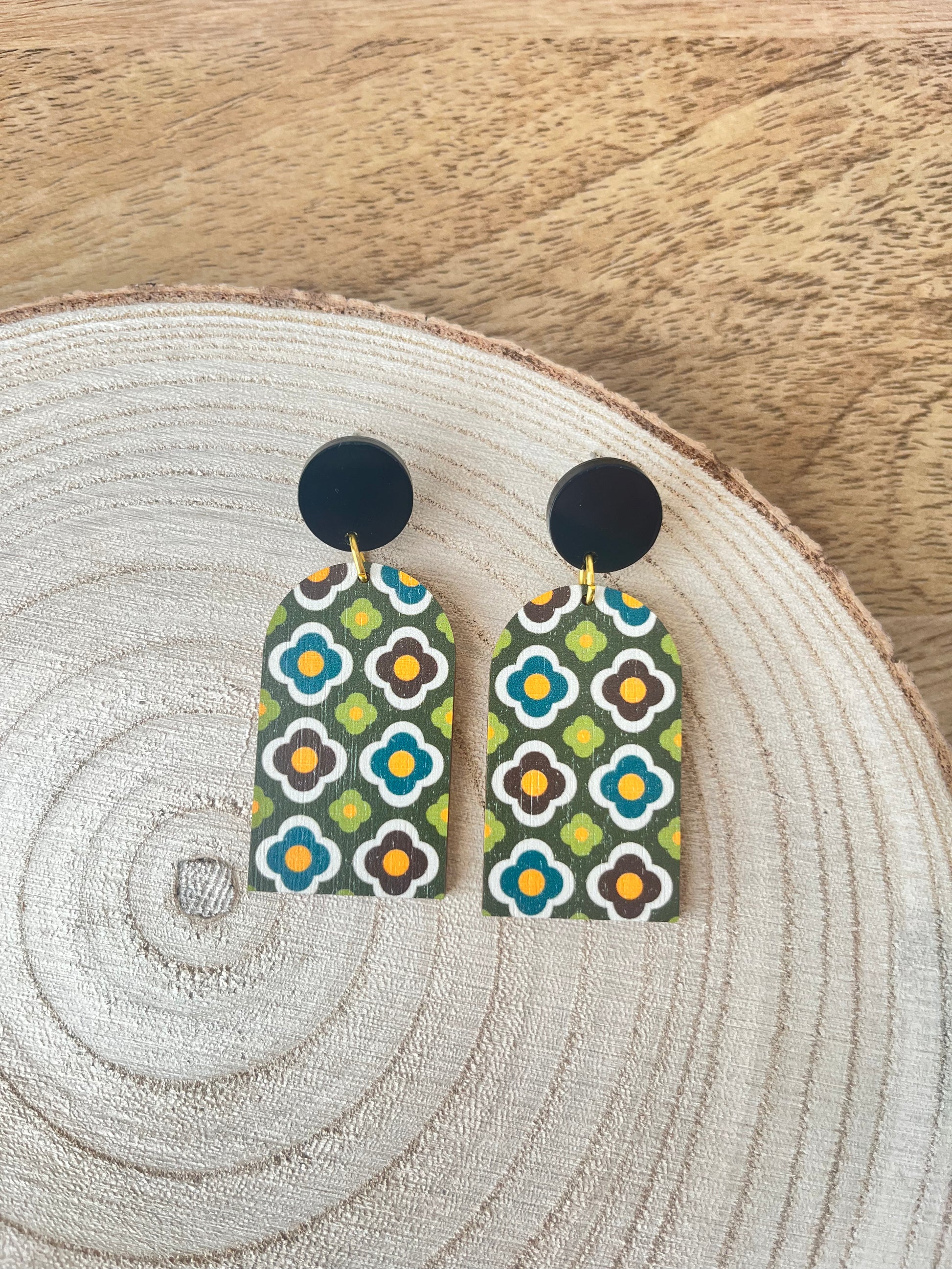 Make a statement with a pair of retro green floral dangle earrings; retro inspired, eco-friendly lightweight wooden statement earrings. Made by the brand Hey There Munchquin.