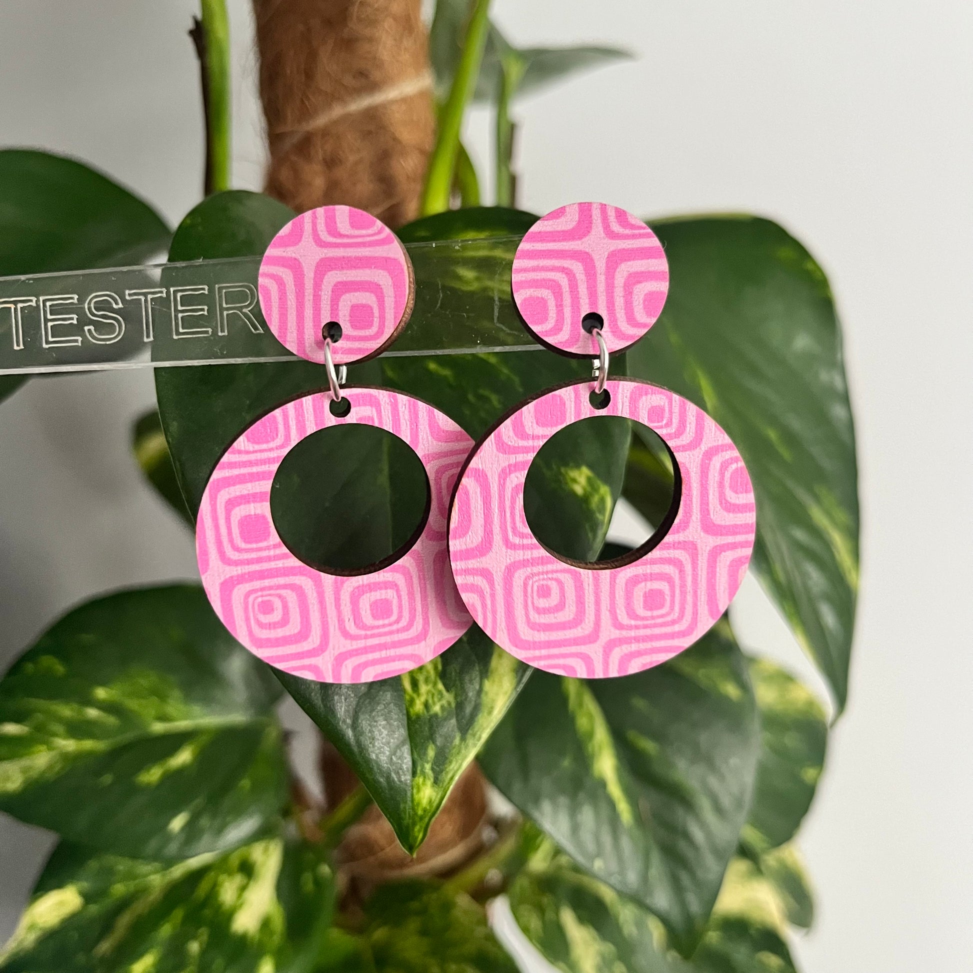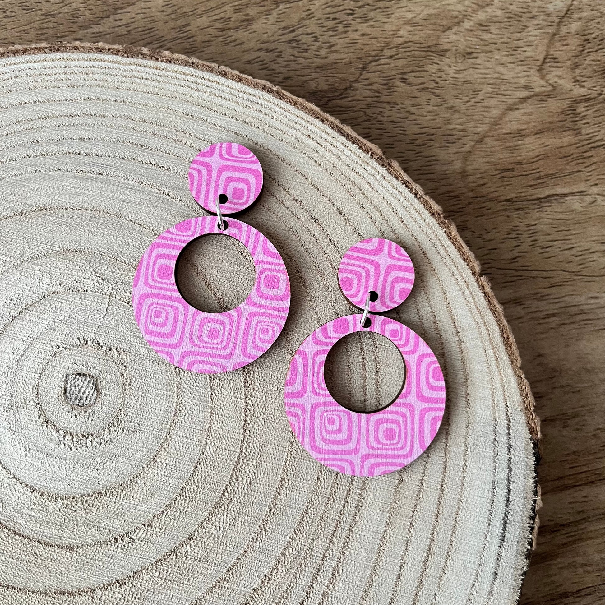 Funky 60s wallpaper inspired earring patterns. This was an early design that was created with polymer clay and has since been brought back as a staple and made using FSC certified wood rather than polymer clay.