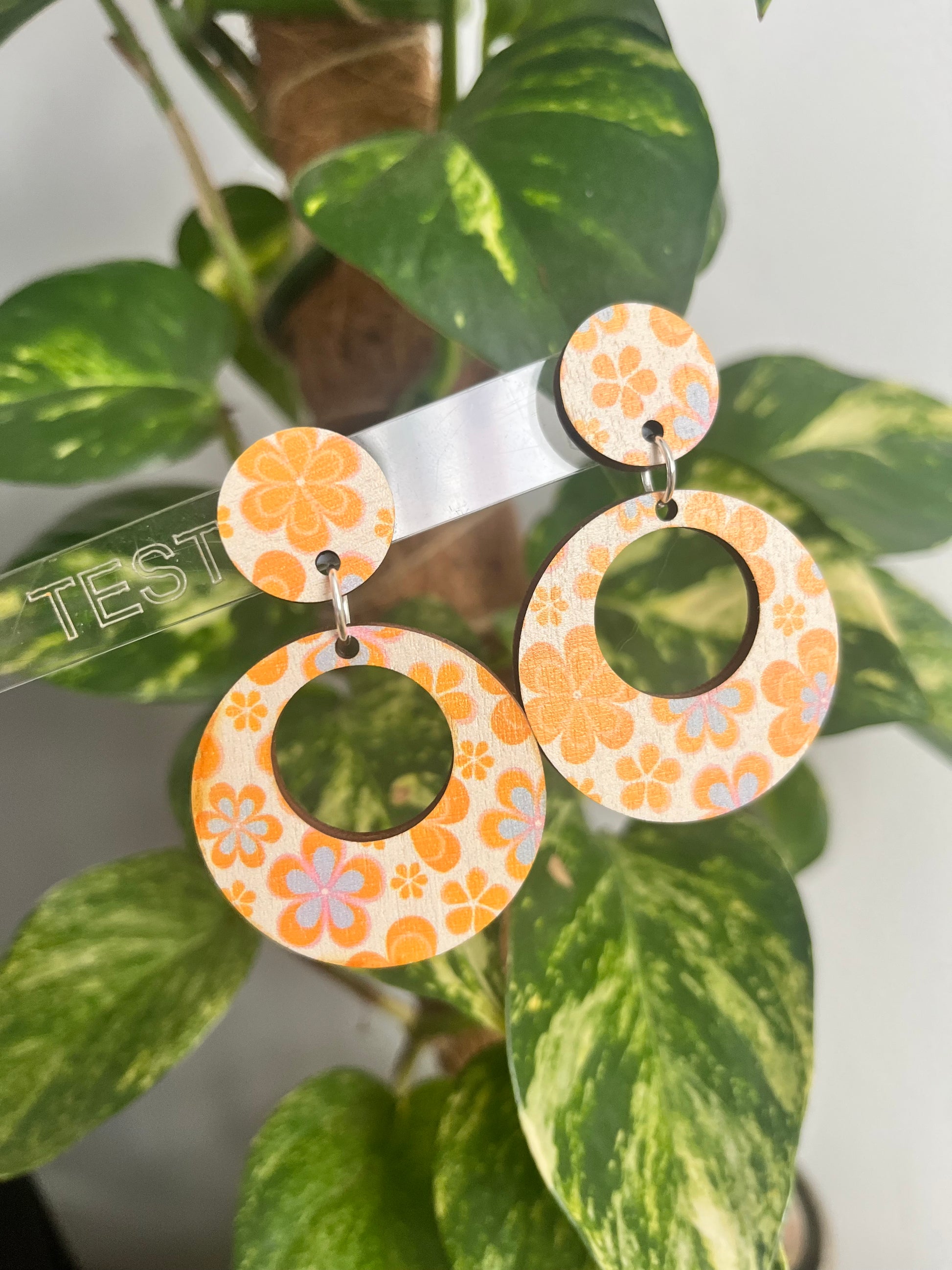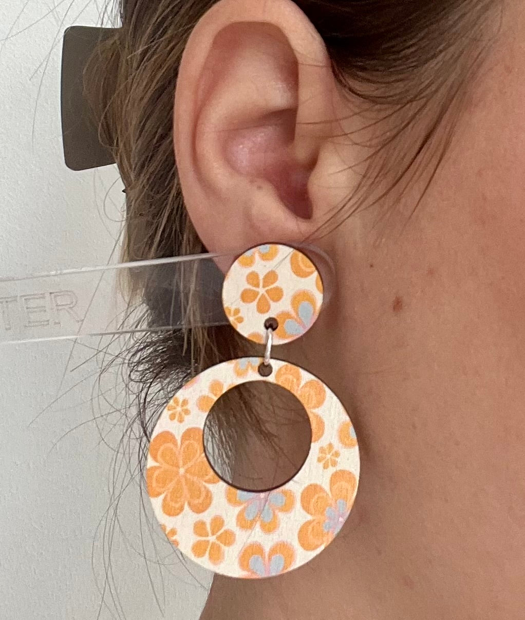 Pretty flower power earrings. This was an early design that was created with polymer clay and has since been brought back as a staple and made using FSC certified wood rather than polymer clay.