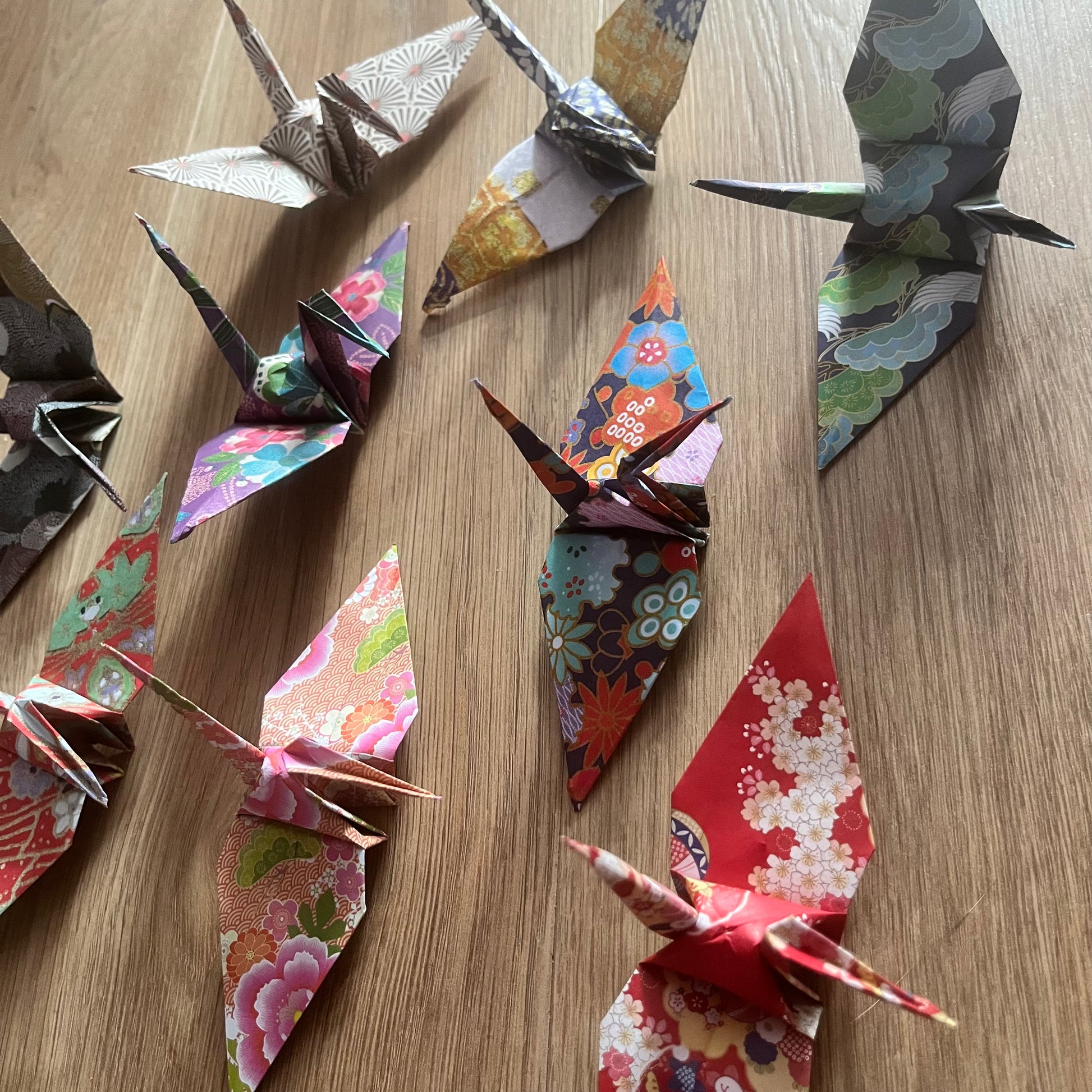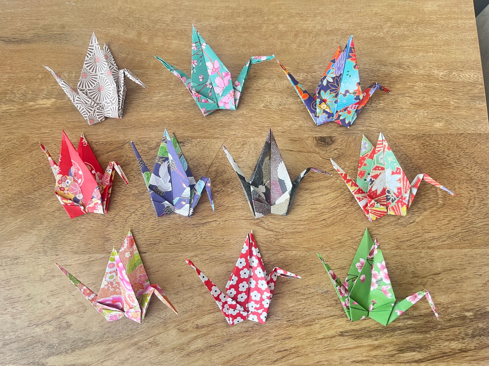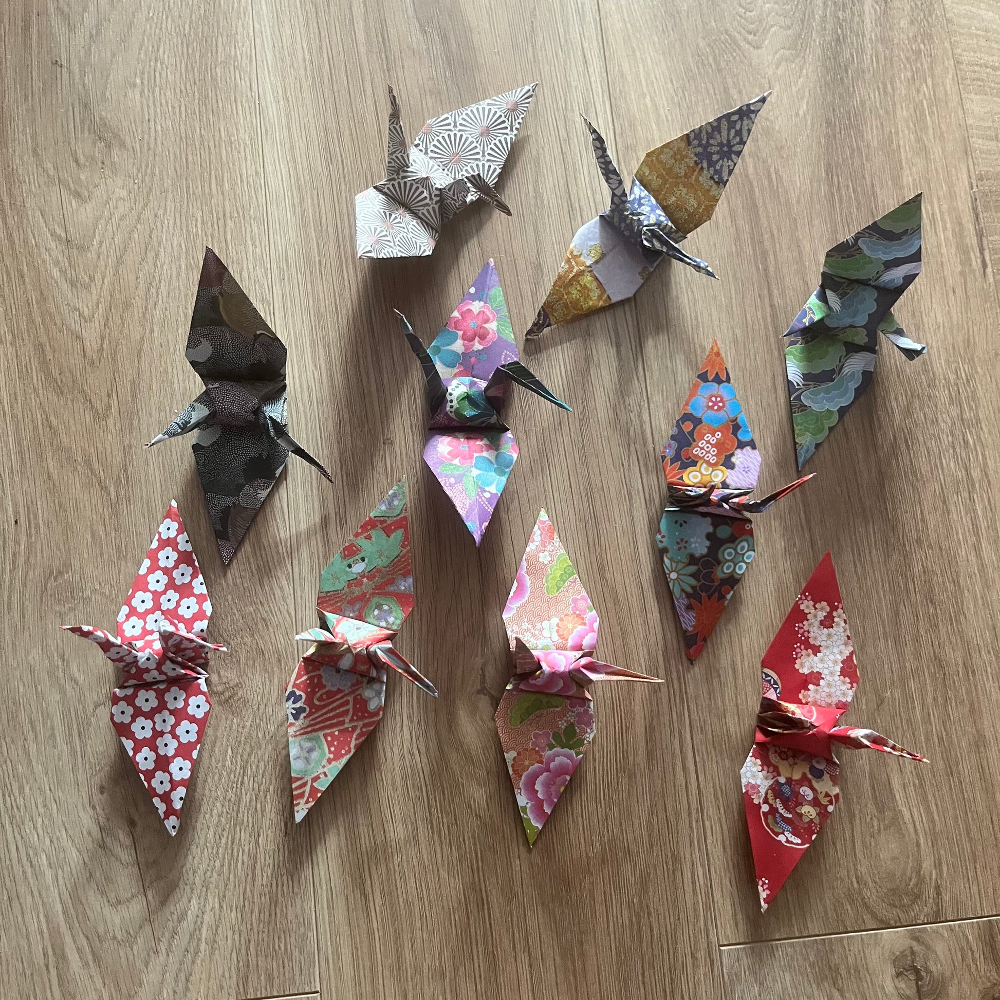 A mix of 10 handmade origami cranes made using Washi pattern origami paper.
