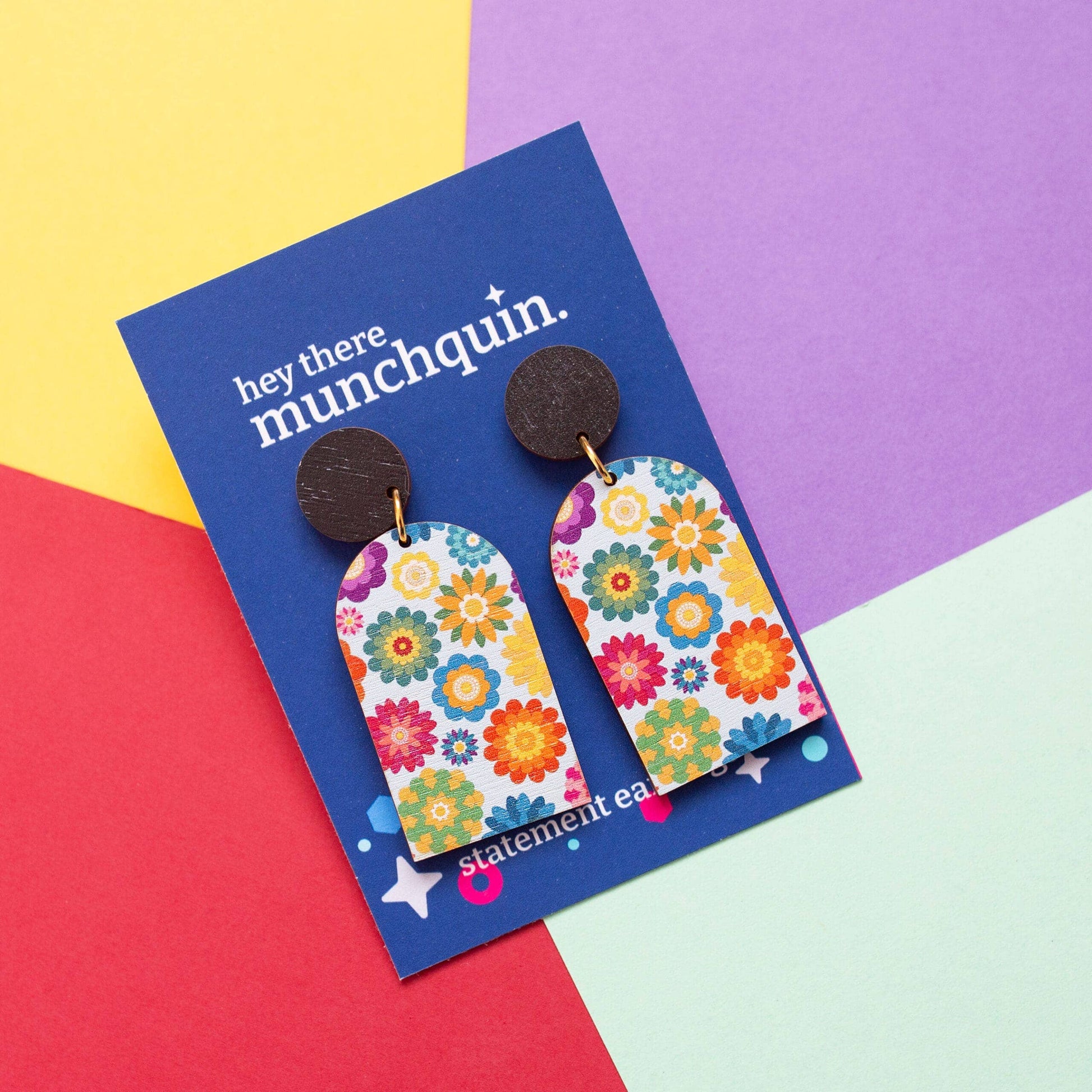 Make a statement with a pair of colourful retro flower patterned earrings; eco-friendly lightweight wooden statement earrings. Made by the brand Hey There Munchquin.