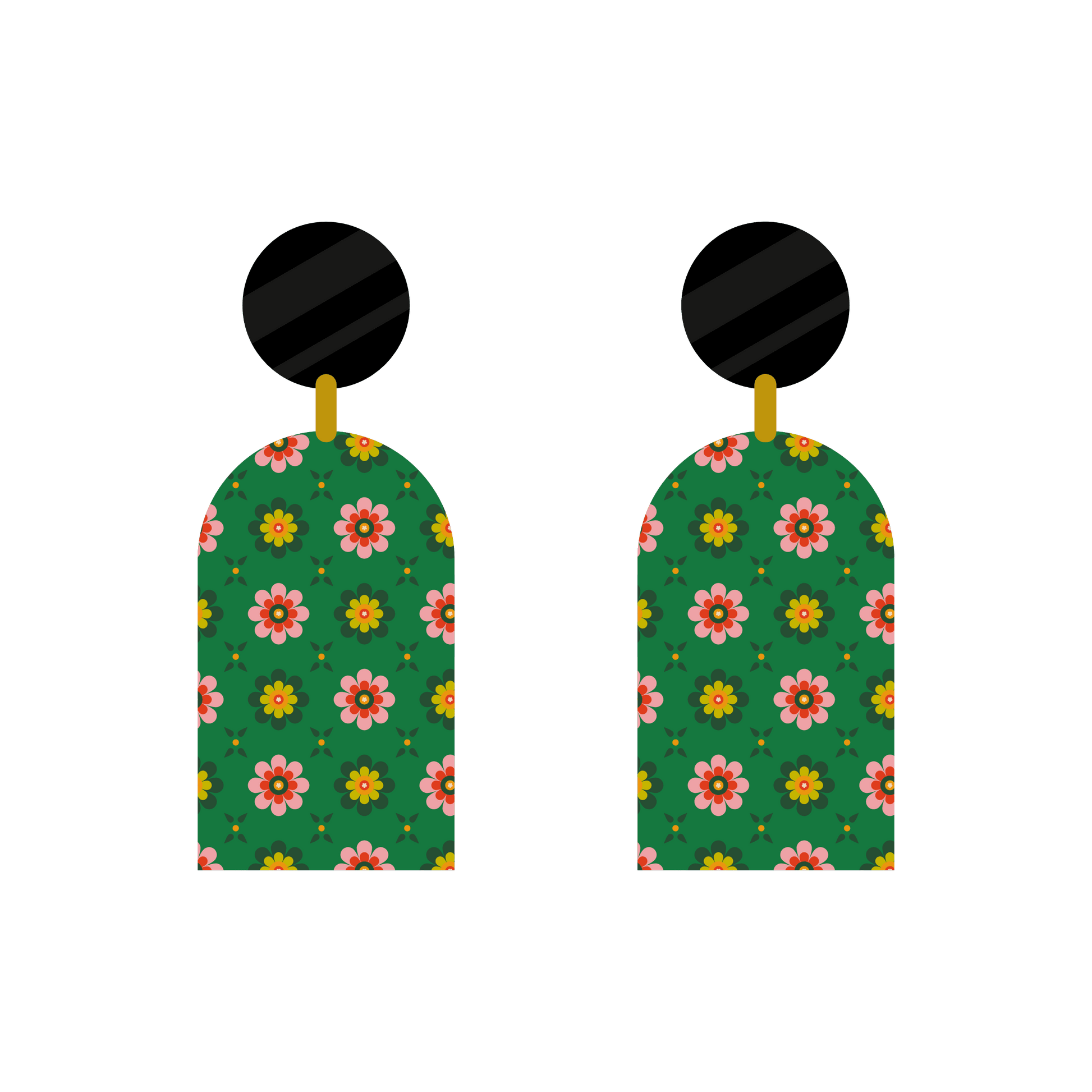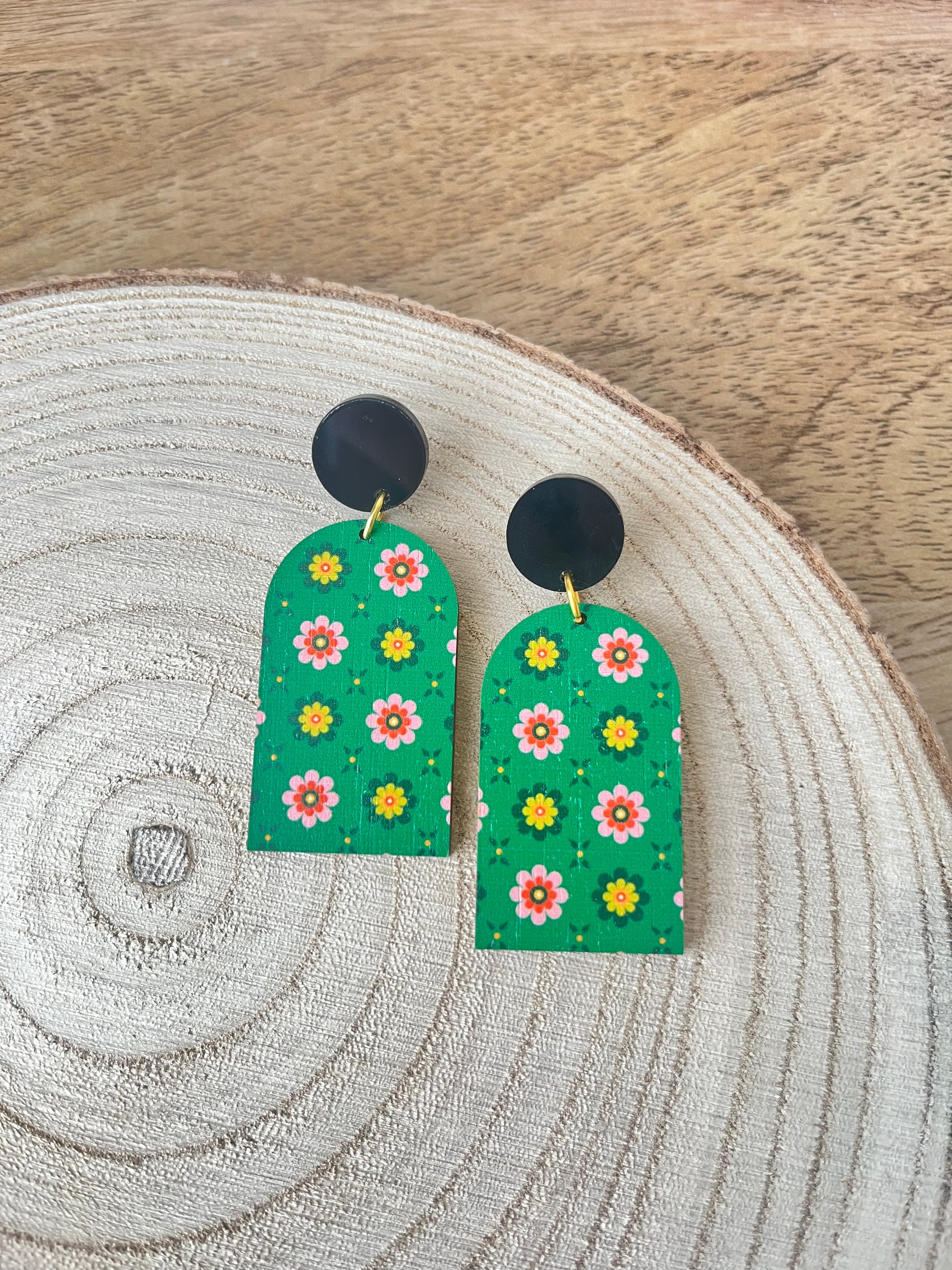 Make a statement with a pair of colourful green and pink floral patterned earrings; eco-friendly lightweight wooden statement earrings. Made by the brand Hey There Munchquin.