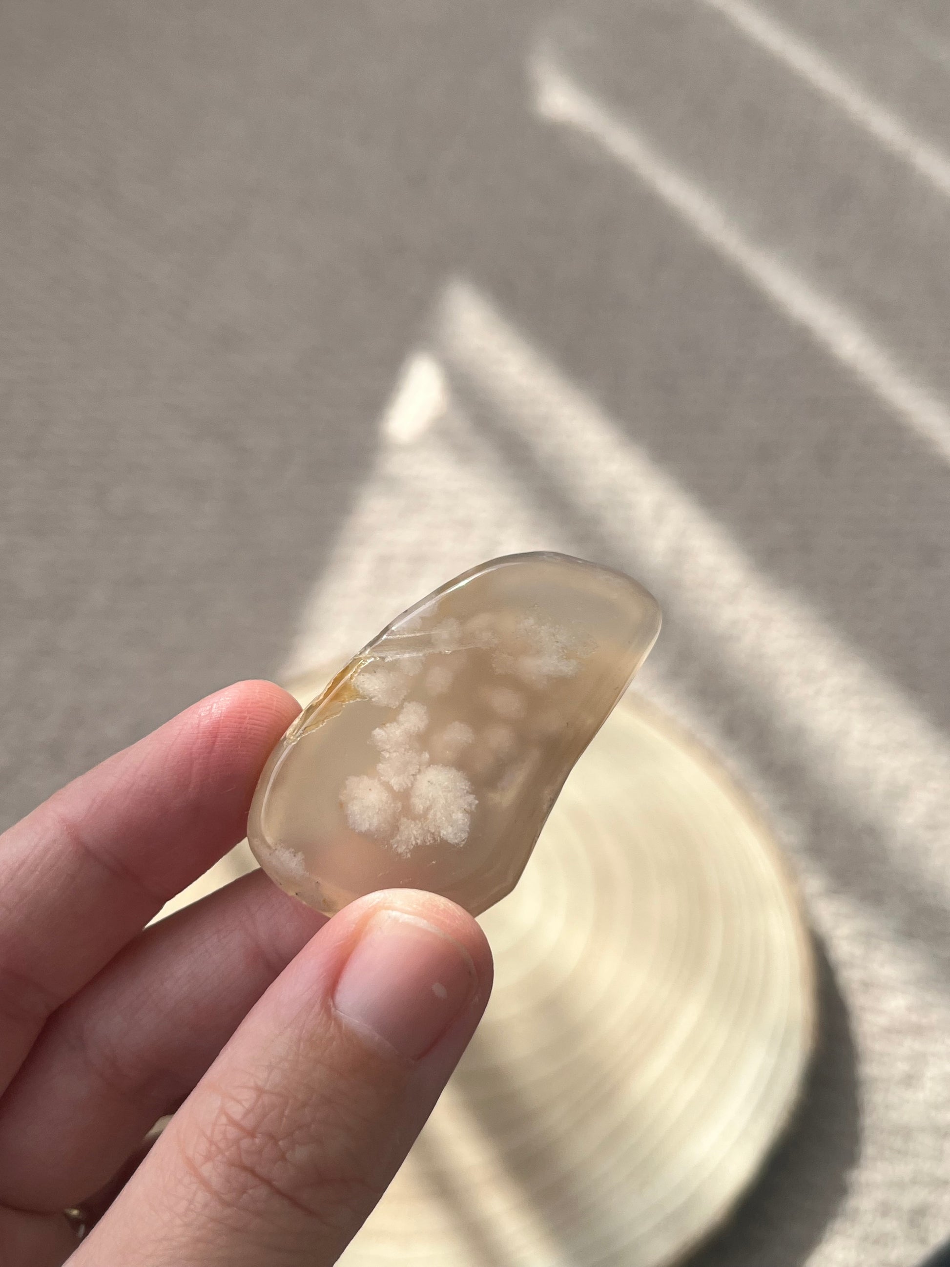 Flower Agate carries a gentle yet powerful energy, encouraging growth, transformation, and emotional healing. Its soft pink hues, intertwined with delicate white plumes, resemble blossoming flowers—symbolizing the journey from seed to full bloom. This crystal is deeply connected to the Heart and Root Chakras, helping to bridge the gap between emotions and reality, fostering self-discovery and inner strength. Known for its ability to reduce stress, inspire creativity, and promote joy