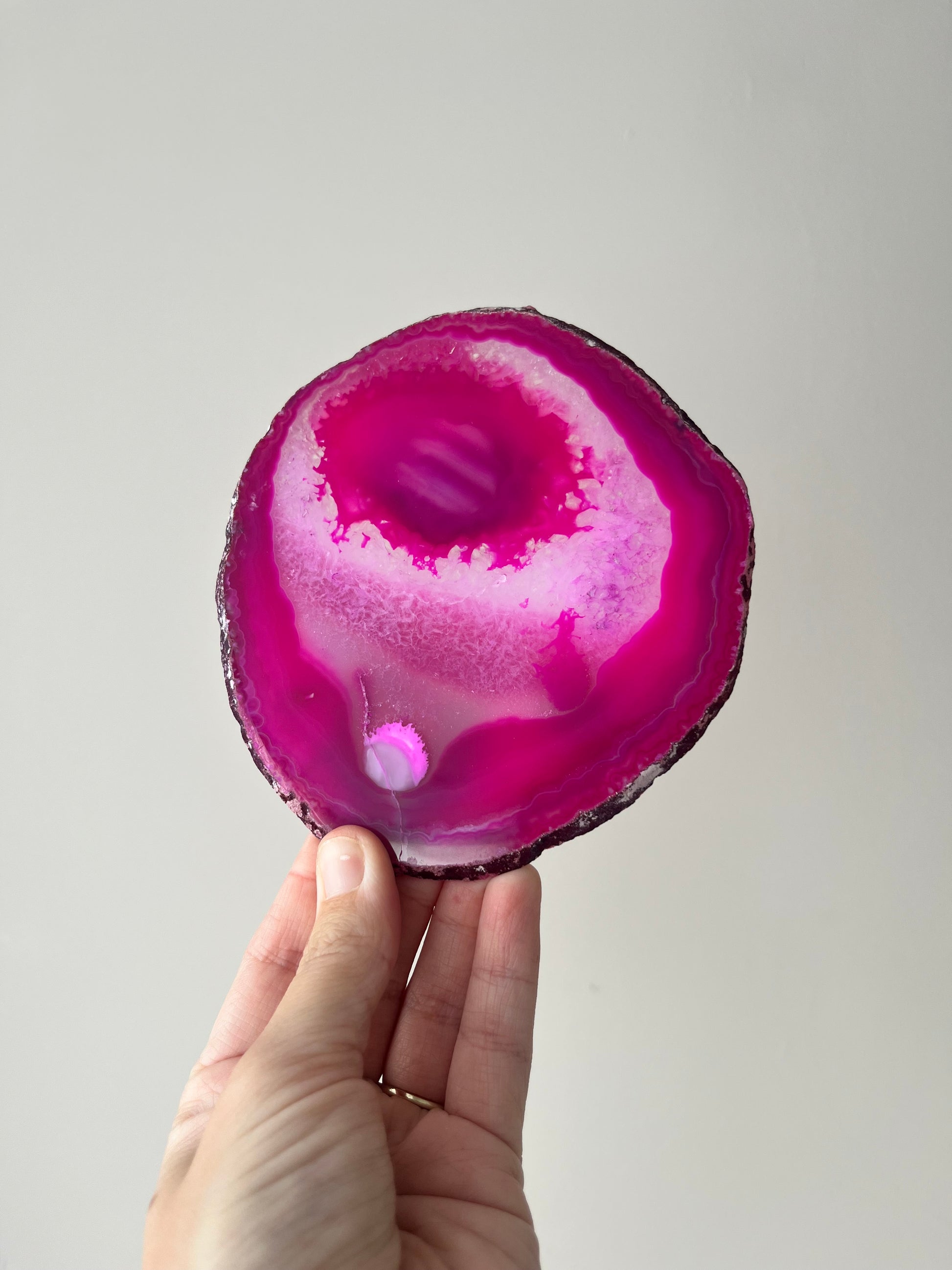 This stunning pink agate slice is a perfect blend of beauty and elegance, featuring mesmerizing swirls and bands of soft pink hues. Naturally formed over thousands of years, agate is known for its soothing energy and grounding properties, making it a wonderful addition to any collection.